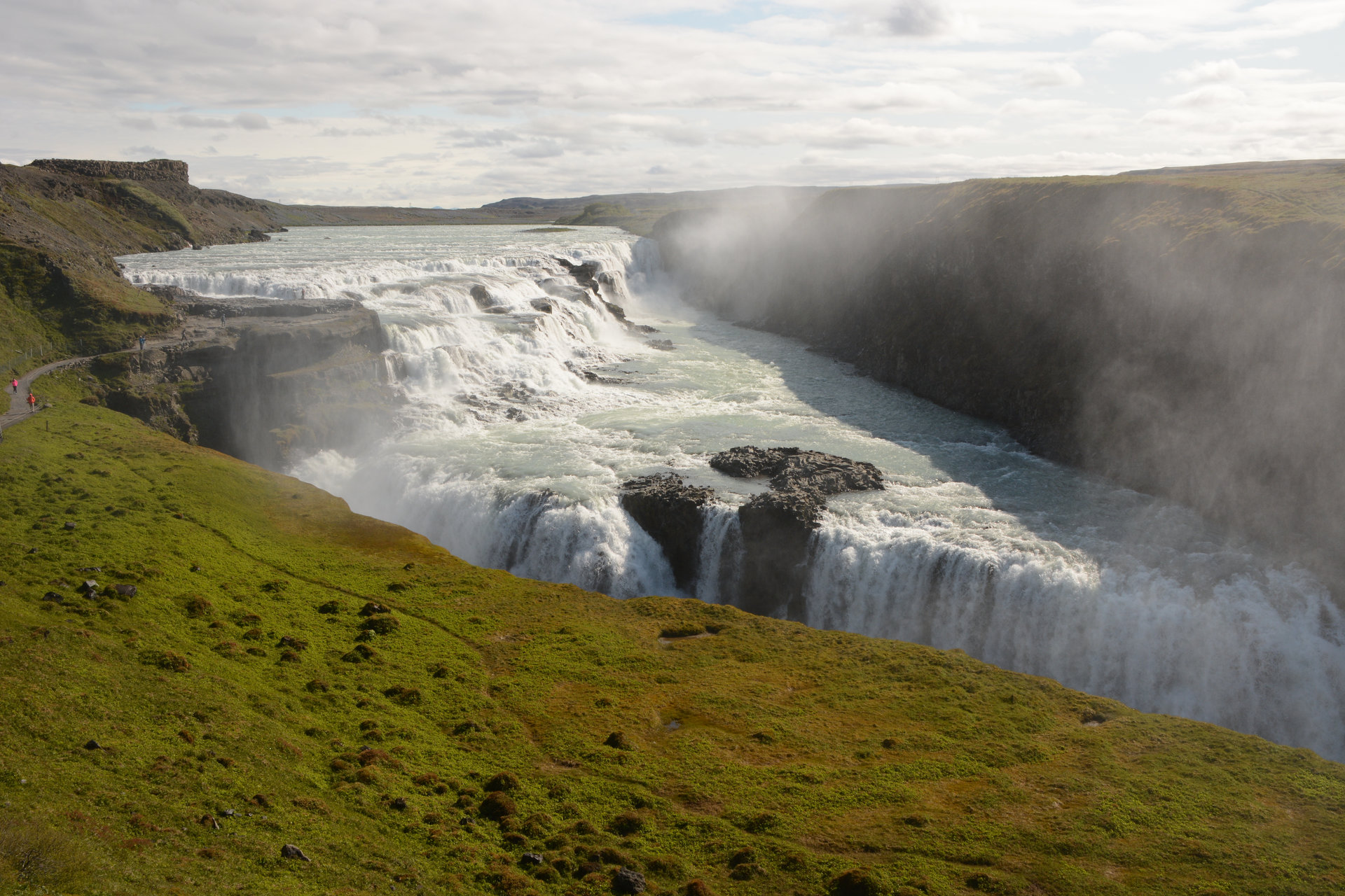 Gullfoss und dann zu einem Geysirfeld. Alles unweit der Unterkunft. Wir sind sehr früh dran, denn im Laufe des Vormittags kommen die Busse aus Reykjavík und dann wird's voll.
