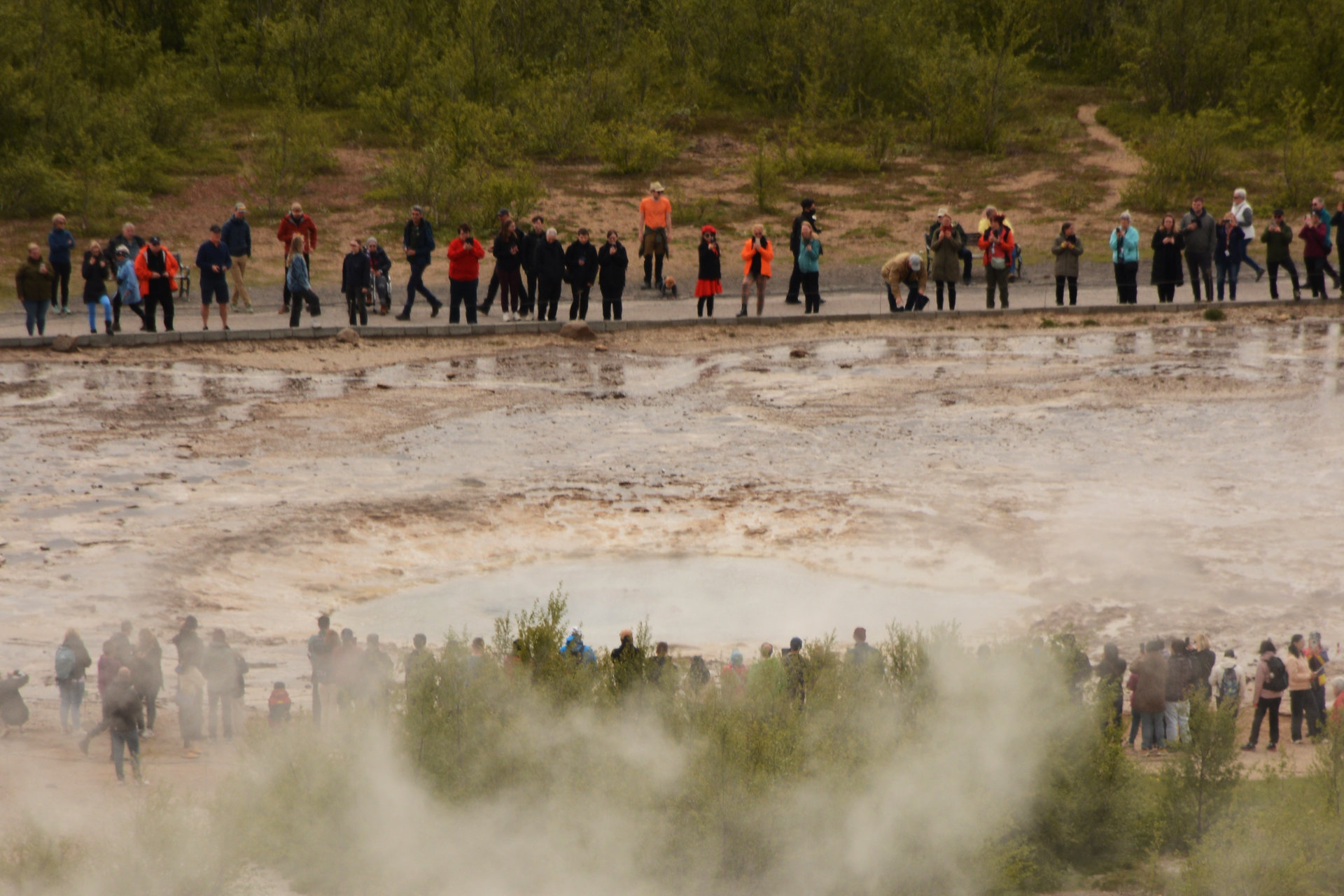 Von einer Aussichtsplattform kann man auch auf den eruptierenden Geysir schauen. Nach dem Runterlaufen stellen wir uns auch noch mal zu dem Spektakel an. Man muss nur schnell genug den Auslöser drücken :-).