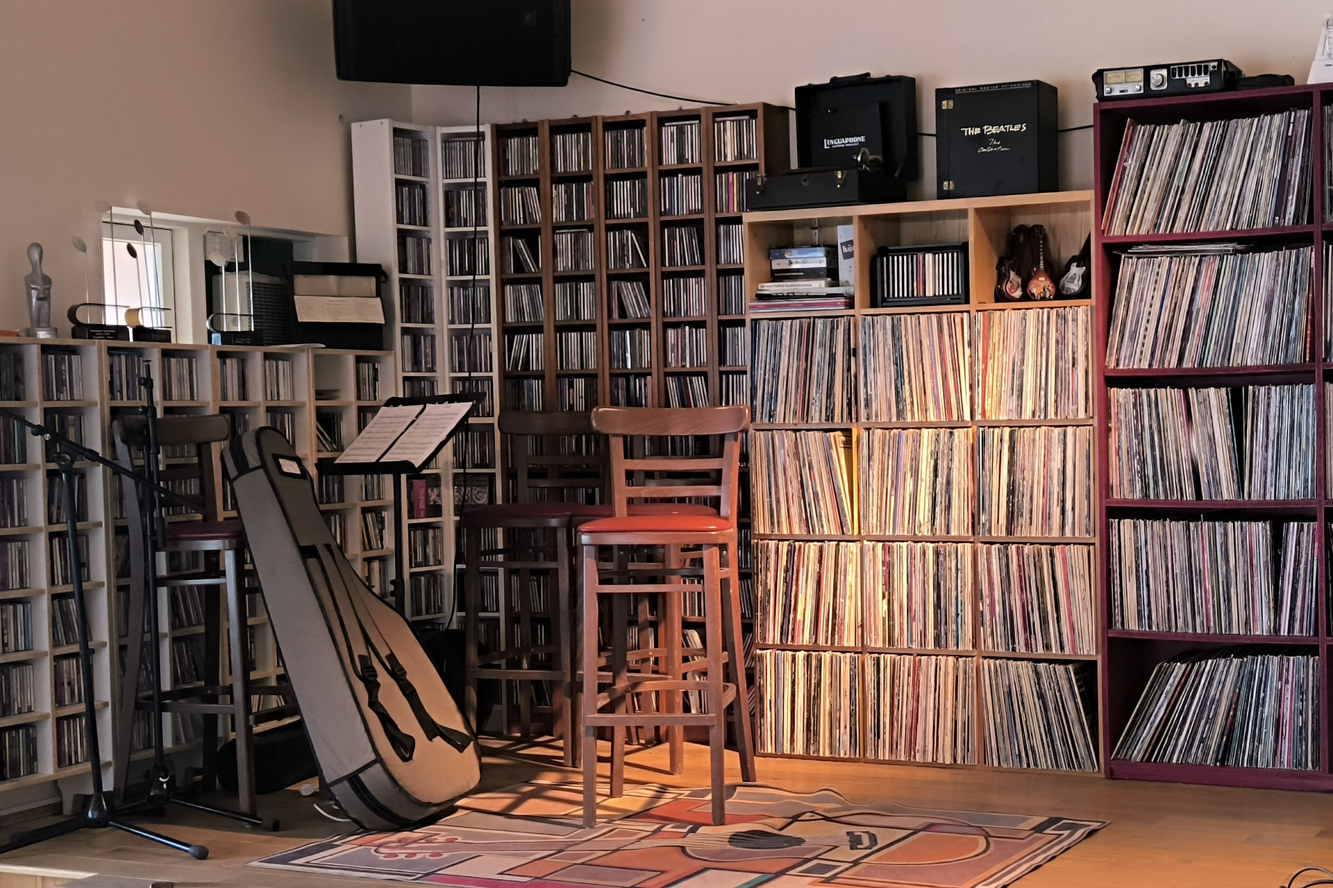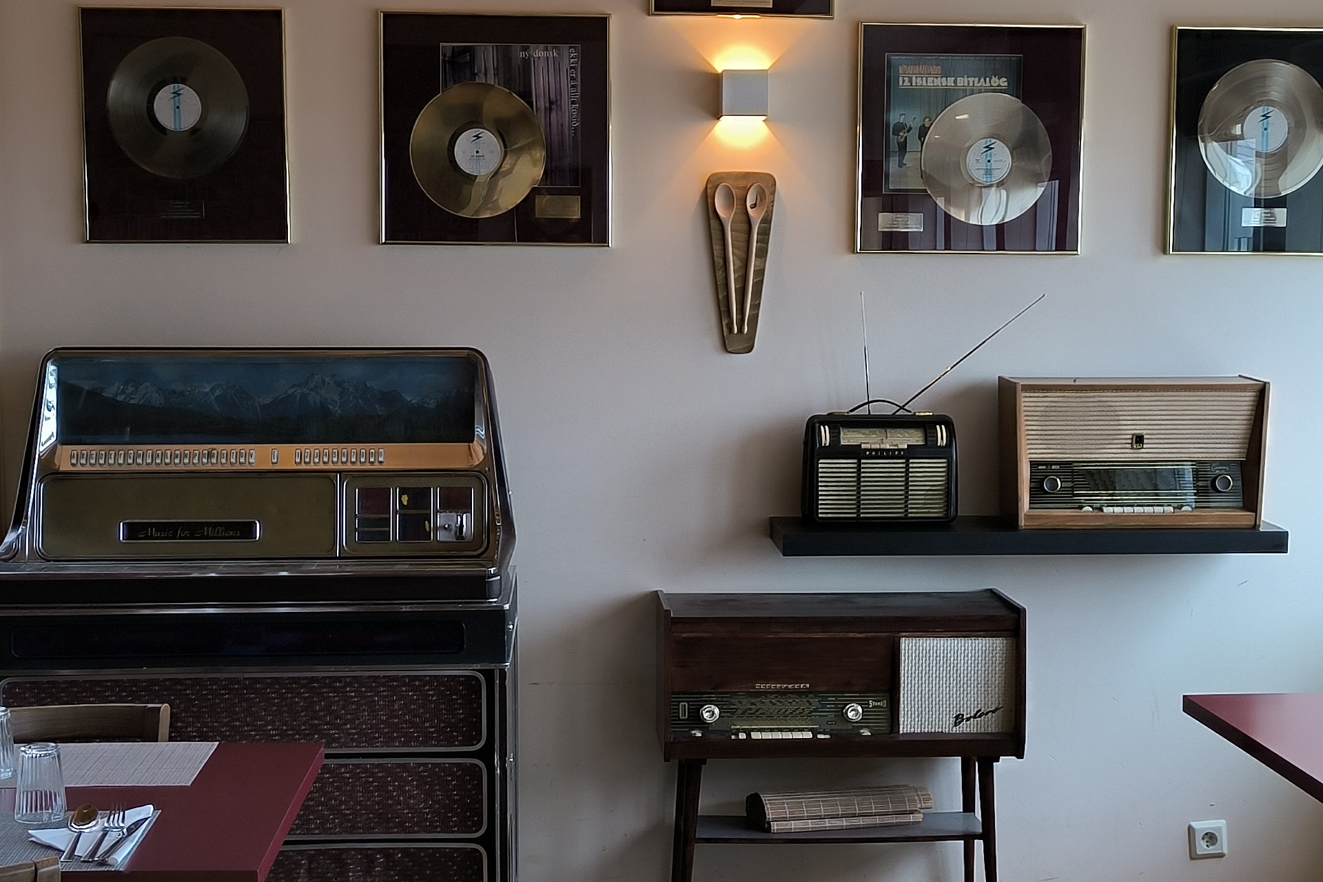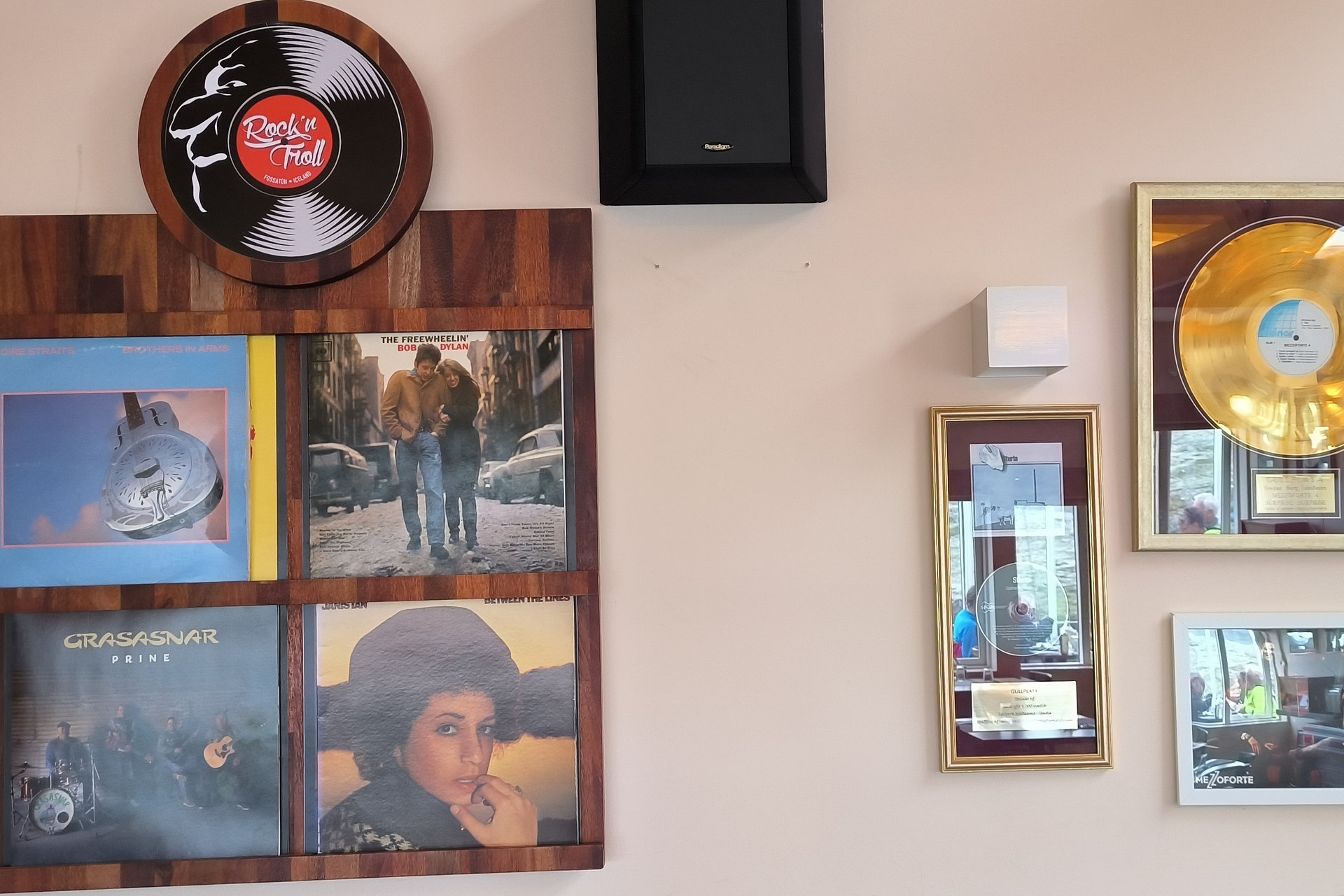 "Rock n' Troll" in Fossatún an dem wir vorher vorbeigefahren sind. Wir können draußen im Wintergarten sitzen - im T-Shirt! Heute gibt es 2 mal Fish n' Chips und 2 🍺 à 0,5 für 9000ISK (1000ISK ~ 7€). Das geht. Der Besitzer ist wohl Schallplattenfan und hat eine beachtliche Sammlung. Außerdem einige alte Radios in gutem Zustand und eine Musikbox.