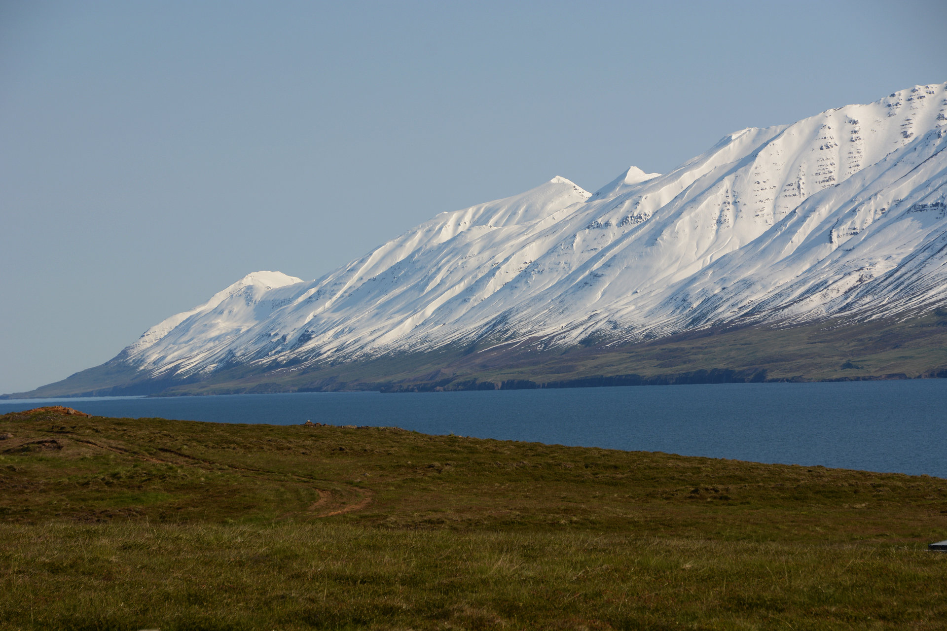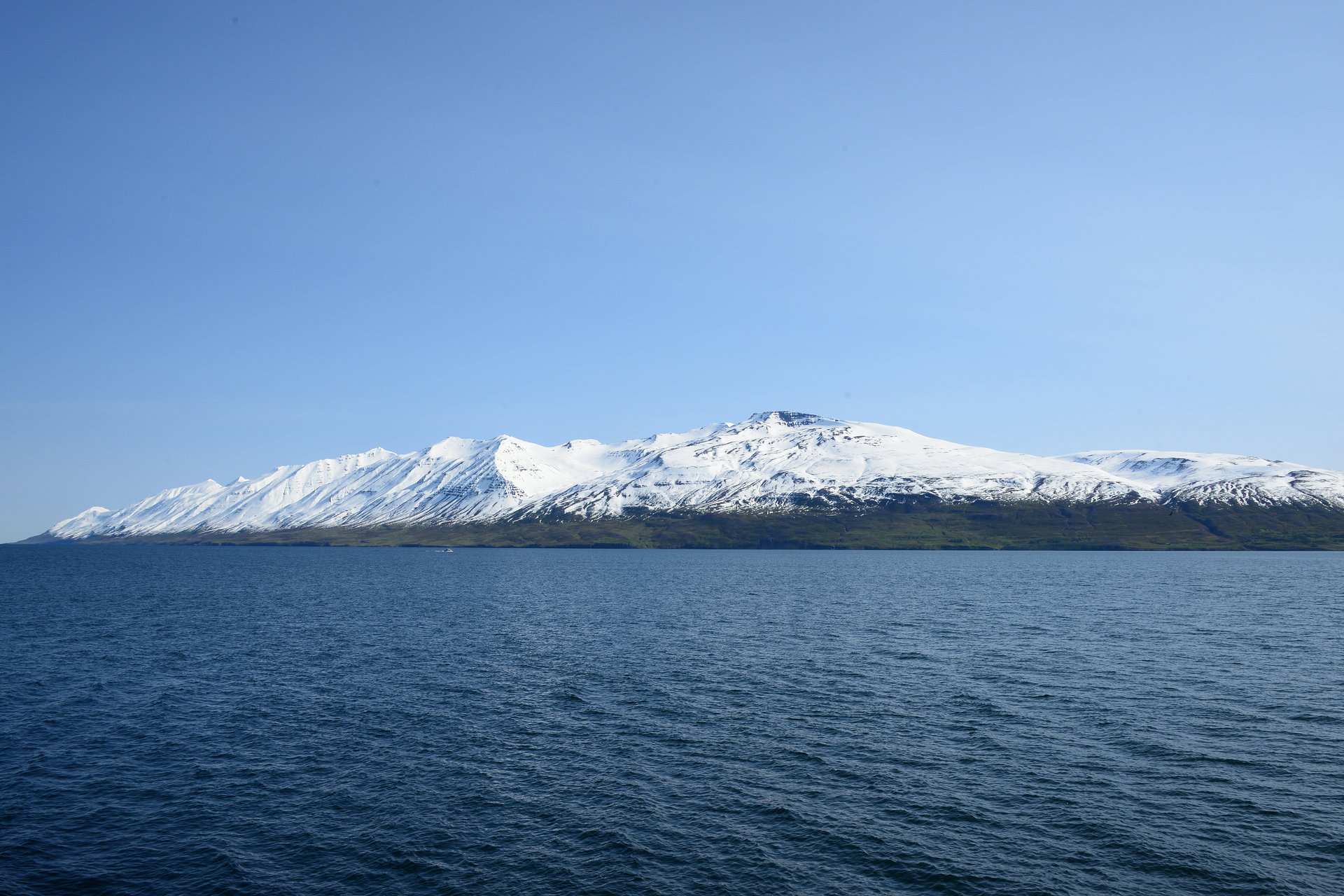 Eyjafjörður. Auf der anderen Seite sehen wir schneebedeckte Hügel und Berge auf denen der blendend weisse Schnee fast bis ans Meer reicht.